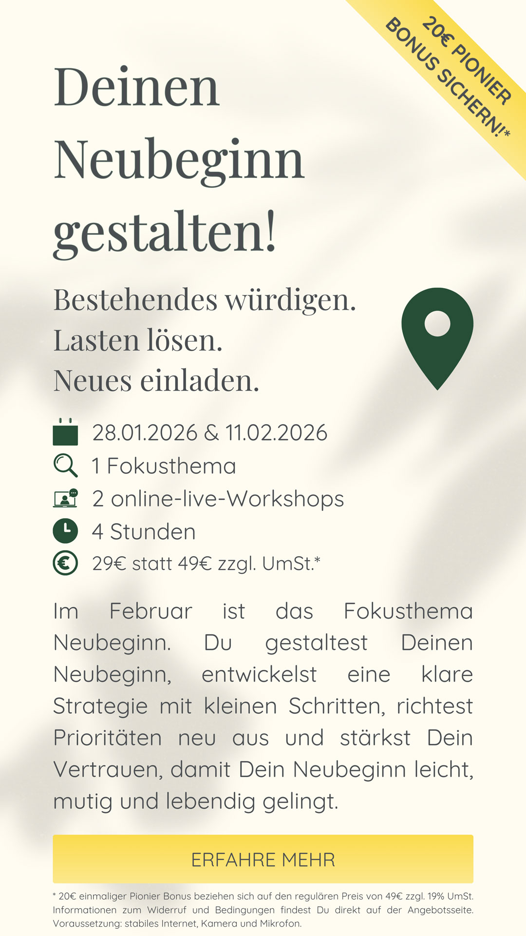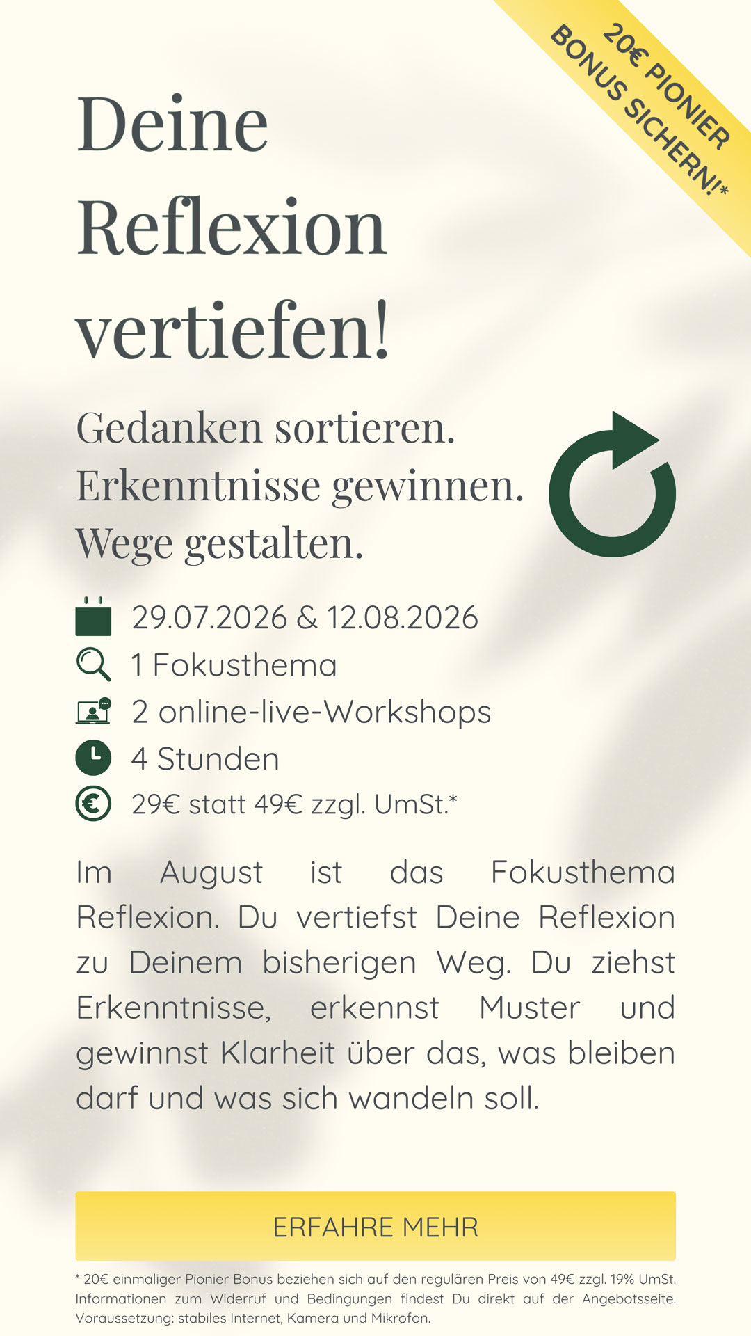 Zum Abschluss würdigen wir die gemeinsamen Erkenntnisperlen, fassen zentrale Ergebnisse zusammen und halten wichtige Impulse fest. Du reflektierst, was Dich besonders bewegt hat und tauschst Dich mit der Gruppe aus. Die erarbeiteten Lösungen integrierst Du nachhaltig in Deinen Alltag.