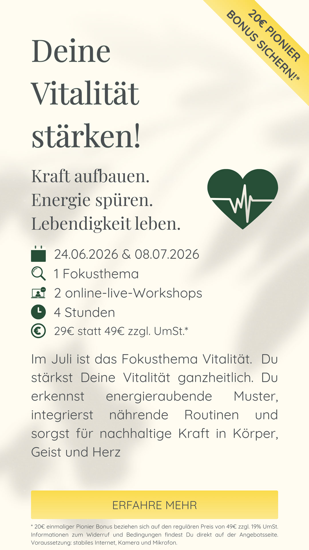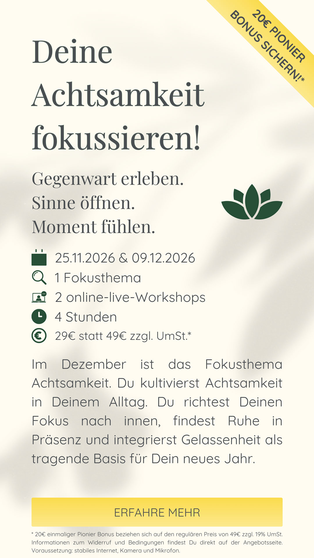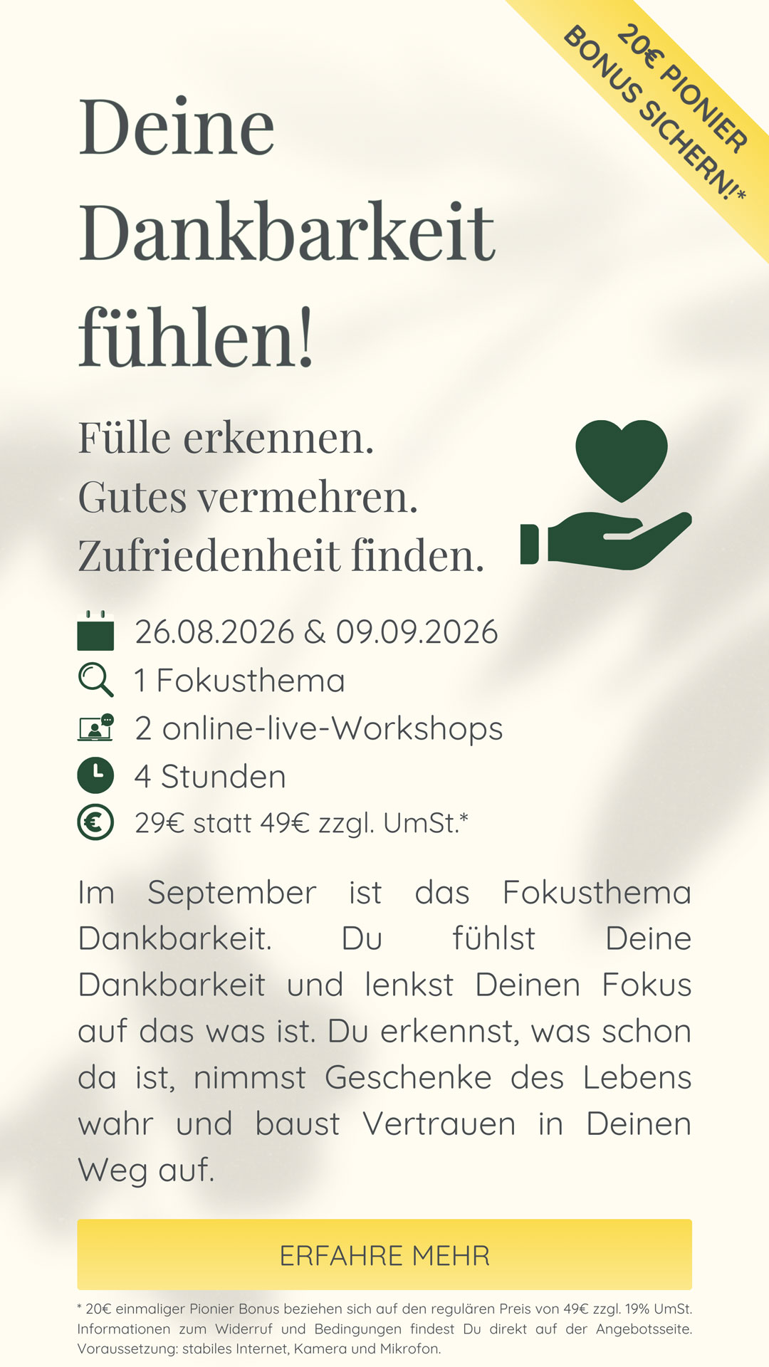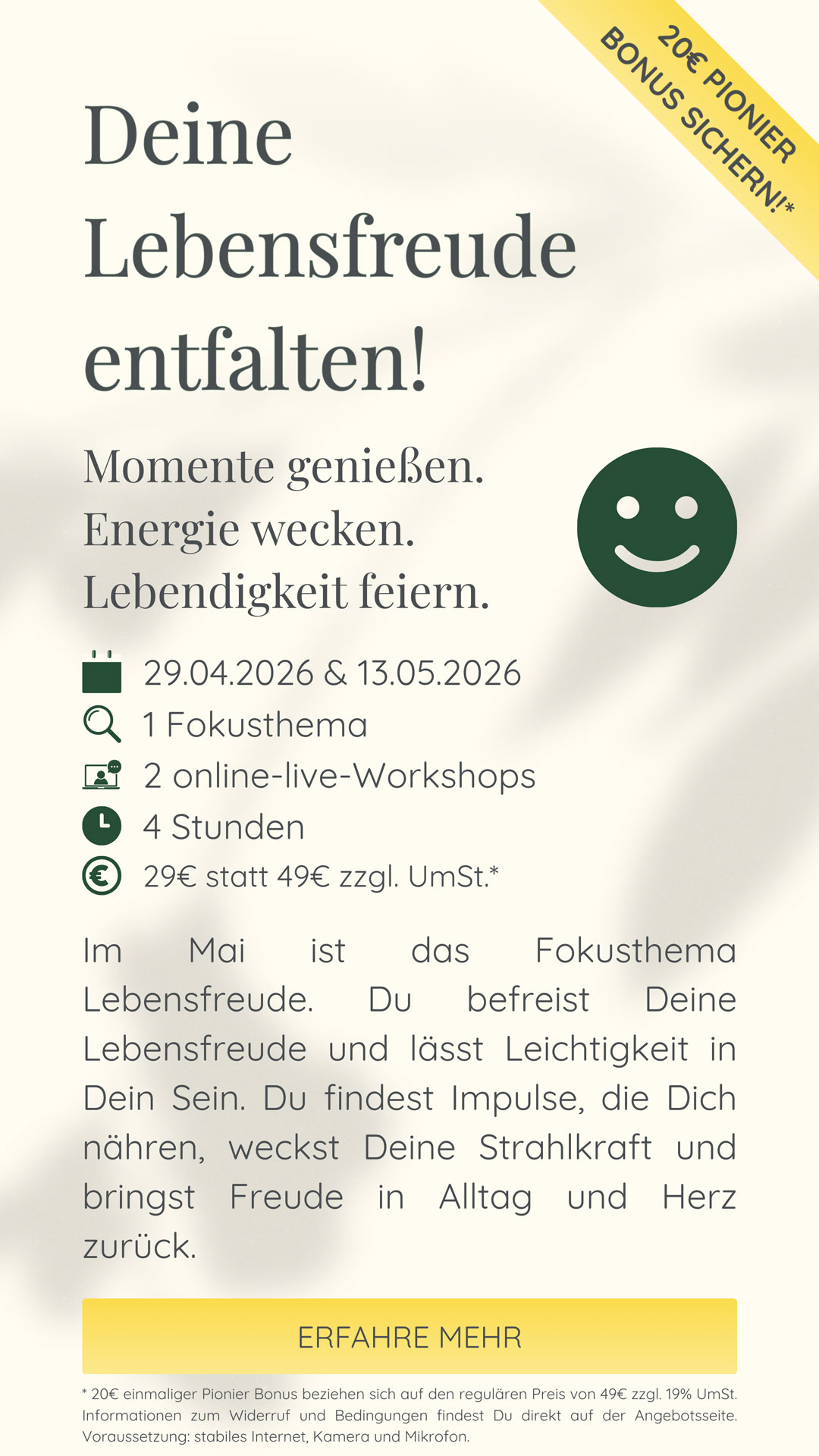 Nach Deinem interaktiven Gruppen-Workshop hast Du Antworten gefunden, Erkenntnisperlen gewonnen, wertvolles Wissen und individuelle Erfahrungen aufgenommen. Impulse zur aktiven Umsetzung in Deinem Alltag mitgenommen und gelernt, dass Du nicht alleine bist. Du hast nicht nur von mir, sondern von einer Gruppe Gleichgesinnten einzigartigen Input bekommen.